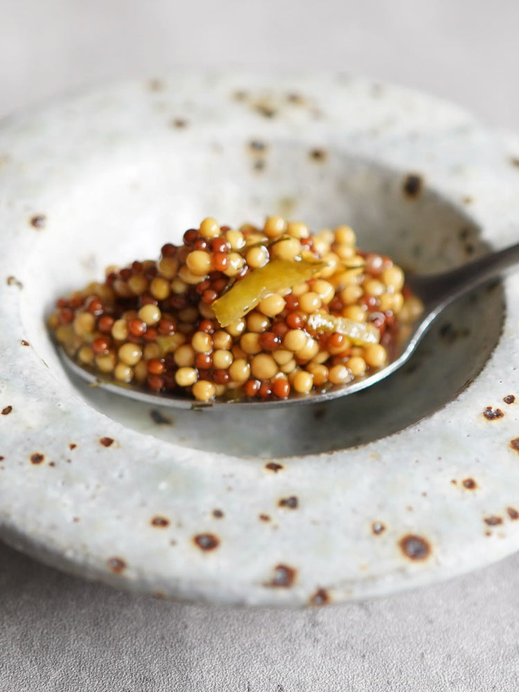 そのまま食べても美味しいぷちぷち食感のマスタード。お得な詰め替え用も販売中。